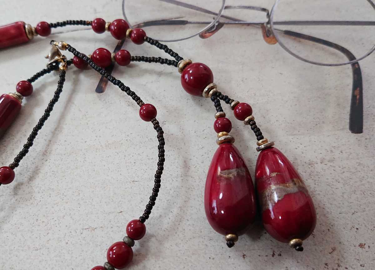 - □オリエンタル&アジアン□エンジ×模様入り変形ビーズ×黒ビーズのロング丈ネックレス□