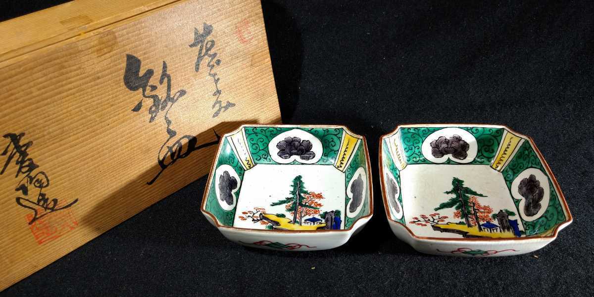- 九谷焼 「花ごよみ飾皿」 山水 角皿 2客揃 飾皿 共箱 黄布 a-41(43)b852