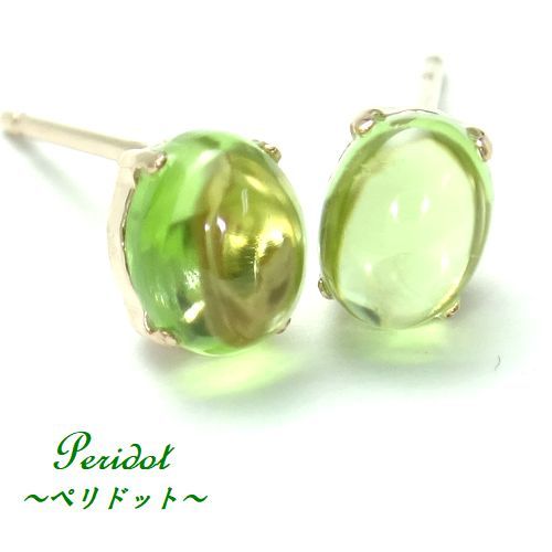 > 8月誕生石★ペリドット オーバル カボション K10 WG YG スタッドピアス 5x4 ジュエリー 天然石 楕円形 選べるゴールド 箱付き