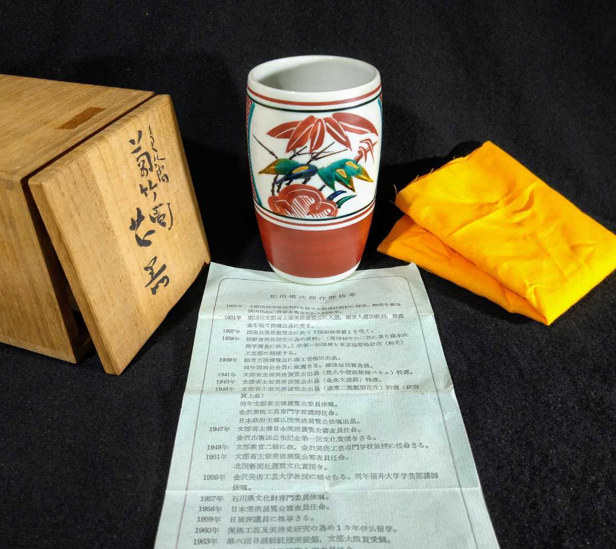- 北出塔次郎 「菊竹図花器」 金彩 色絵 菊竹図 花入 共箱 黄布 花瓶 花器 茶道具 華道具 a-05k162