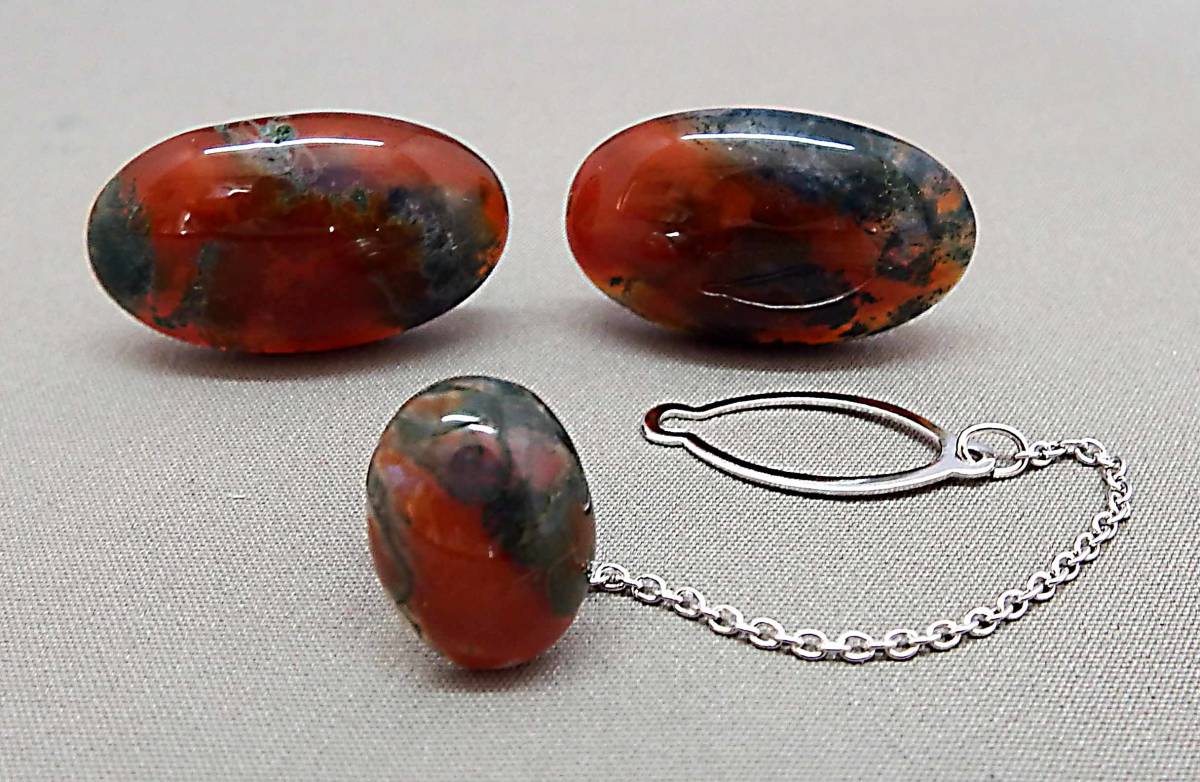 - EU-0251■天然石 モスアゲート カフス&タイタック 楕円型 赤茶×グリーン 中古
