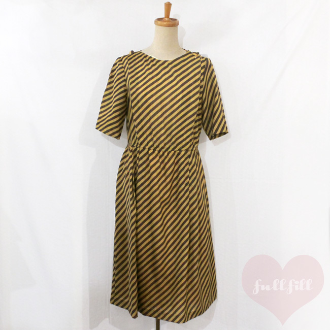 > 古着 ワンピース 斜めストライプ キャラメルブラウン 昭和レトロ 昭和古着 70s ヴィンテージ vintage ビンテージ バイヤスストライプ