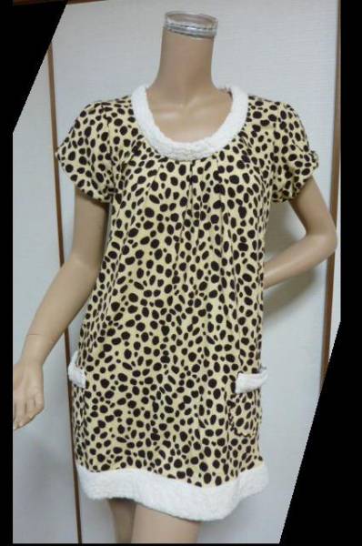 - 匿名配送 送料無料 新品 ダルメシアン柄 もこもこ ボア付き 半袖 ワンピース ベージュ クリスマス パーティー レディース M パフスリーブ