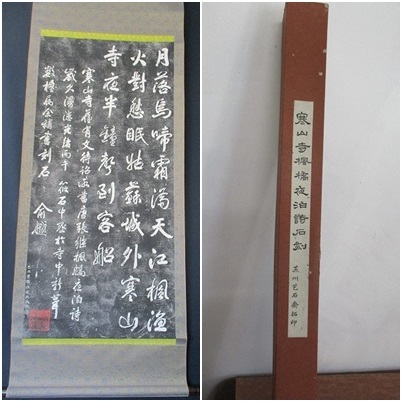- ★掛軸 寒山寺楓橋夜泊詩石刻 汚れ・上部に虫食い等あり状態悪い 縦179.5㎝ 横68.5㎝ 箱の状態悪い ぼたんー23★