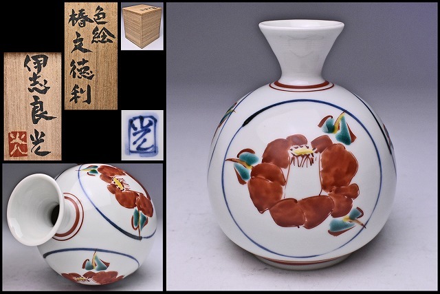 > 伊志良光 ★ 色絵 椿文 徳利 ★共箱 ★ 酒器 ★ 師:人間国宝 藤本能道 / 浅野陽 ★ コロッとした造形に雅な絵付の逸品 ★