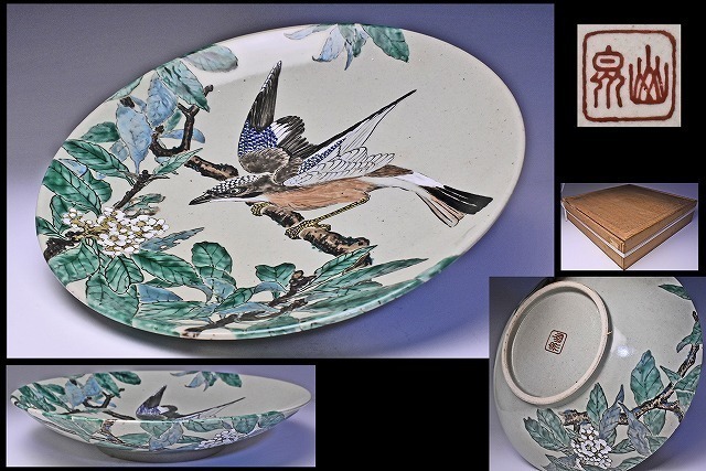 - 山岡山泉 ★ 色絵 鳥花文 大皿 ★ 合せ箱 ★ 37cm! ★ 大作で存在感のある見事な絵付の逸品★ 縁: 河井寛次郎 ★