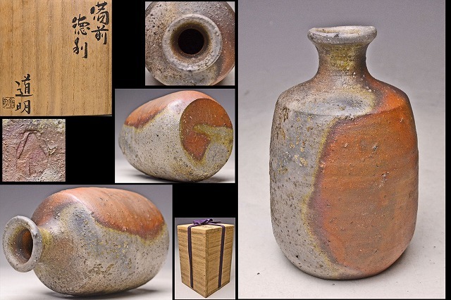 > 金重道明 ★ 備前 肩衝 徳利 ★ 共箱 ★ 父: 人間国宝 金重陶陽 ★ 景色の良い上作 ★ 酒器 ★検 金重晃介