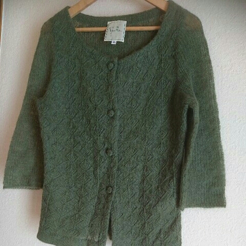 > ブランド シビラ 繊細 かぎ編み 模様編み ニット カーディガン 薄手 モスグリーン グリーン 緑 くるみボタン 袖丈短め 6分か7分丈? ウール