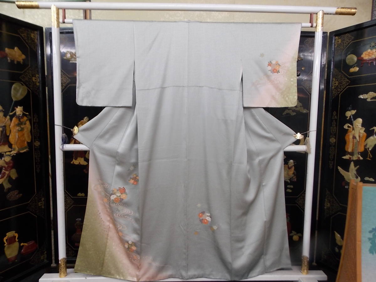 - きもの今昔3015 付け下げ訪問着 正絹綸子地銀ねず色裾ボカシ 観世水花や蝶の柄