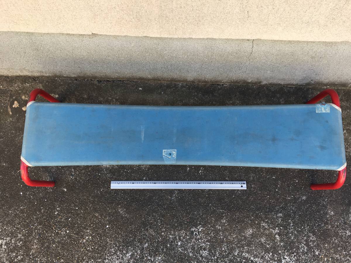古い赤の鉄脚 青いキャンバス生地 長い ベンチシート。幼稚園や小学校の学用かも知れませんが詳しくは不明です。★