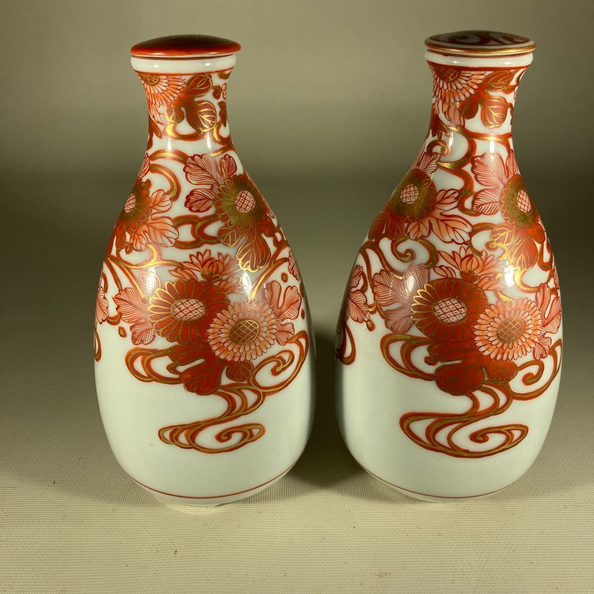 - 嶋田寿楽造 九谷焼 赤絵 金彩 菊図徳利一対 共箱 888