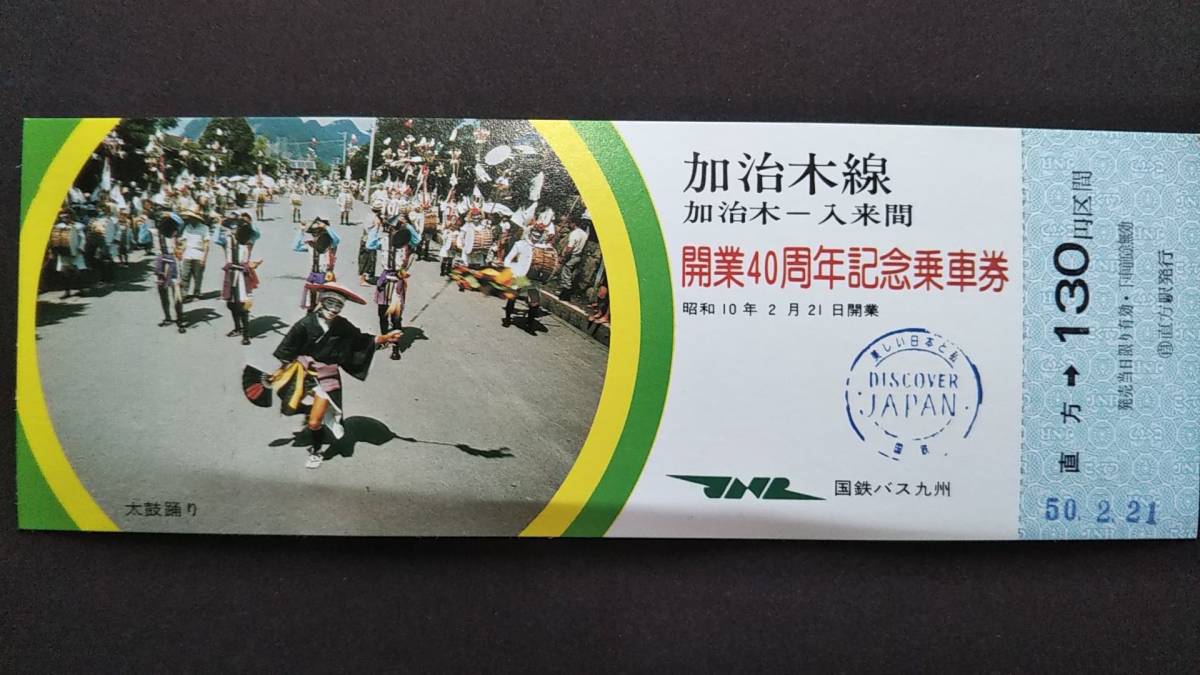 - 0130-36【国鉄バス記念きっぷ】加治木線(加治木~入来間)開業40周年記念乗車券 直方駅発行 昭和50年