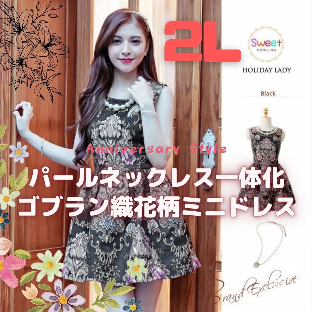 - ミニドレス 黒 2L ワンピース 花柄 新品 即納 XL ゴブラン織 67266 パール風ネックレス付