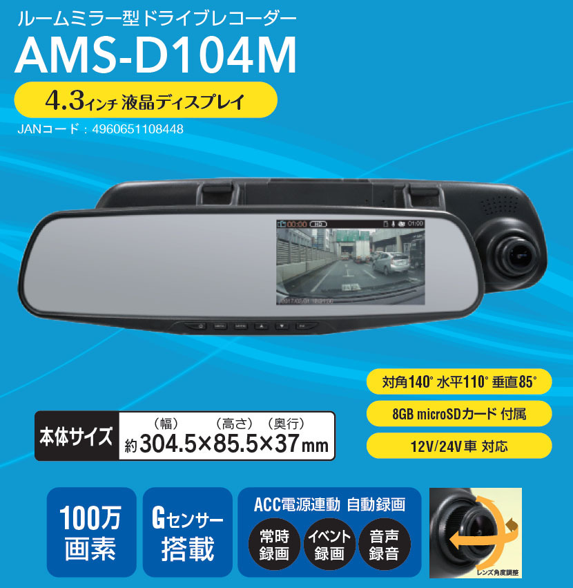 > アムス ドライブレコーダー ミラー型ドライブレコーダー AMS-D104M 4.3インチ 100万画素 常時録画 衝撃録画 Gセンサー オススメ品!!