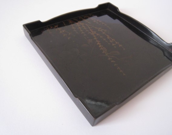- 14N1.20-28 レトロ 柳と椿のデザインのお盆 角盆 トレー 黒 サイズ:約20×20×H2㎝