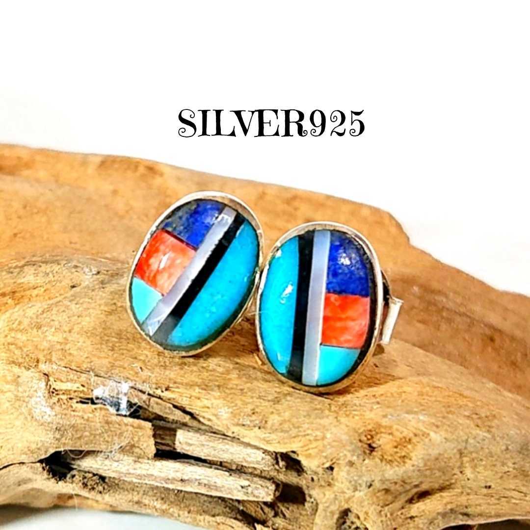 > 5492 SILVER925 ズニピアス シルバー925 ミニ インレイ オーバル 楕円 インディアンジュエリー ワンポイント ターコイズ 珊瑚 綺麗な石