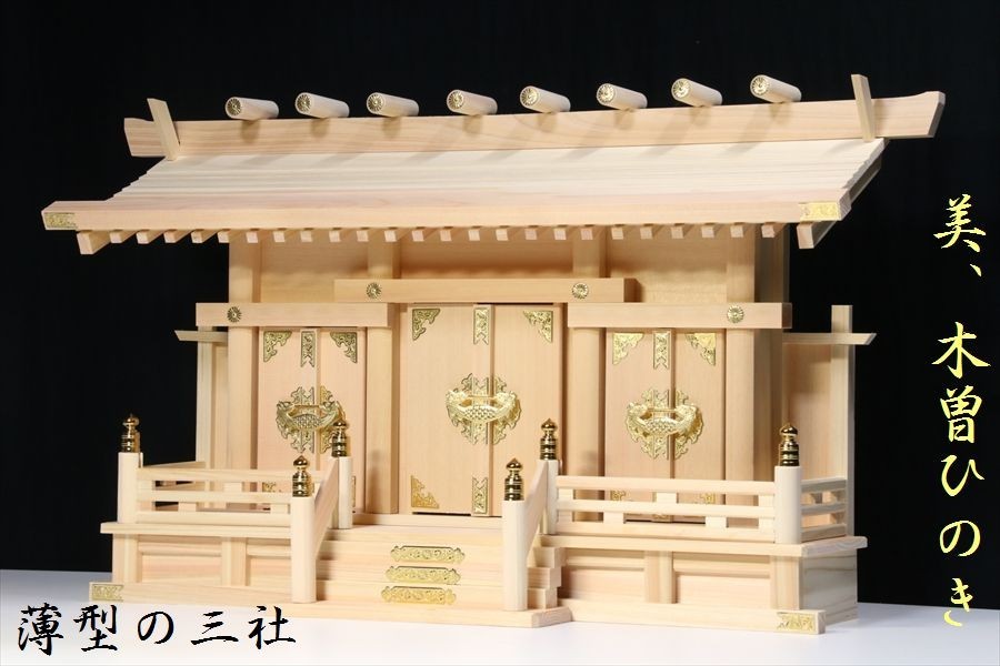 - 美・木曽ひのき■薄型■通し屋根 三社■真鍮装飾 上造り■神棚