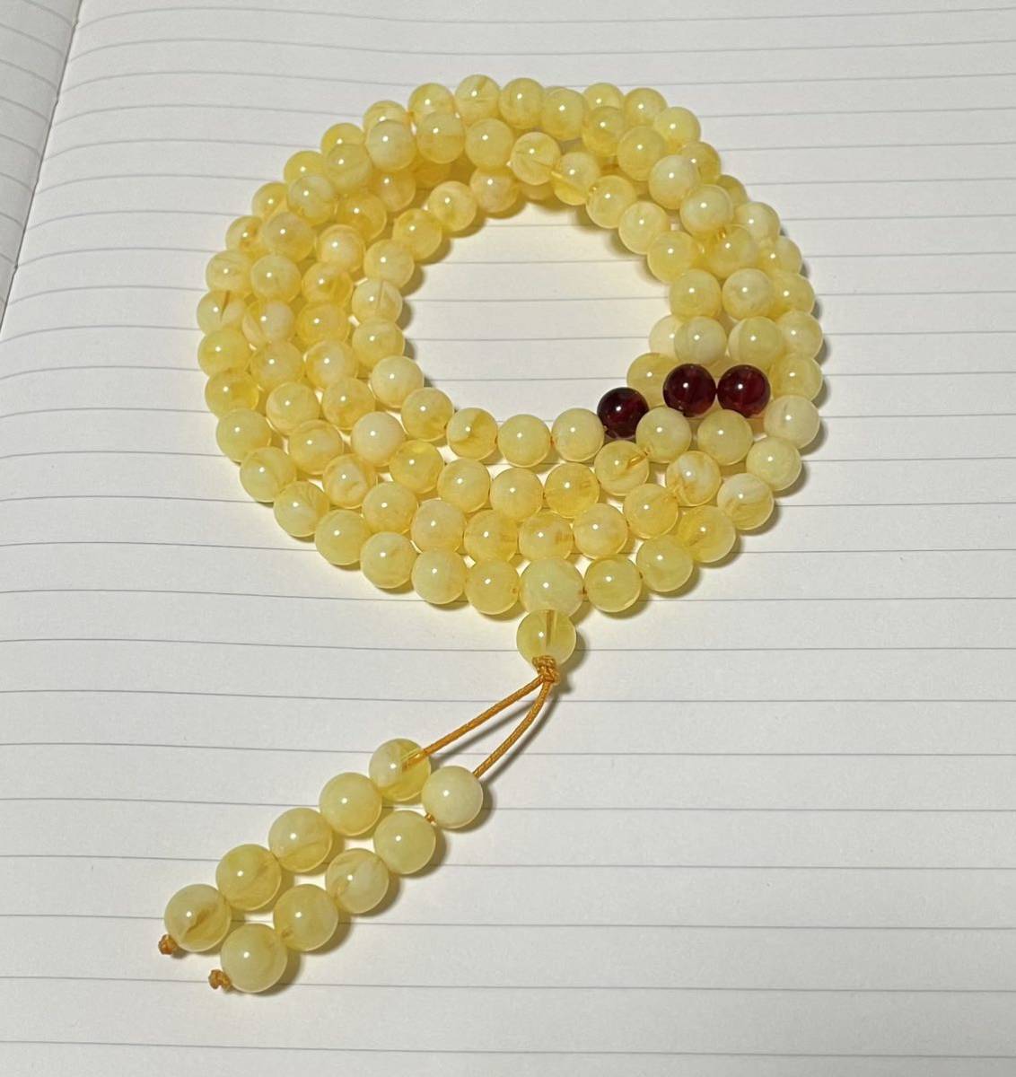- 数珠 念珠 合成琥珀ブレスレット 7mm アンバー 蜜蝋 薄イエロー 108珠 アクセサリー 小物ファッション 男女兼用 パーツ 御守り 魔除け 幸運