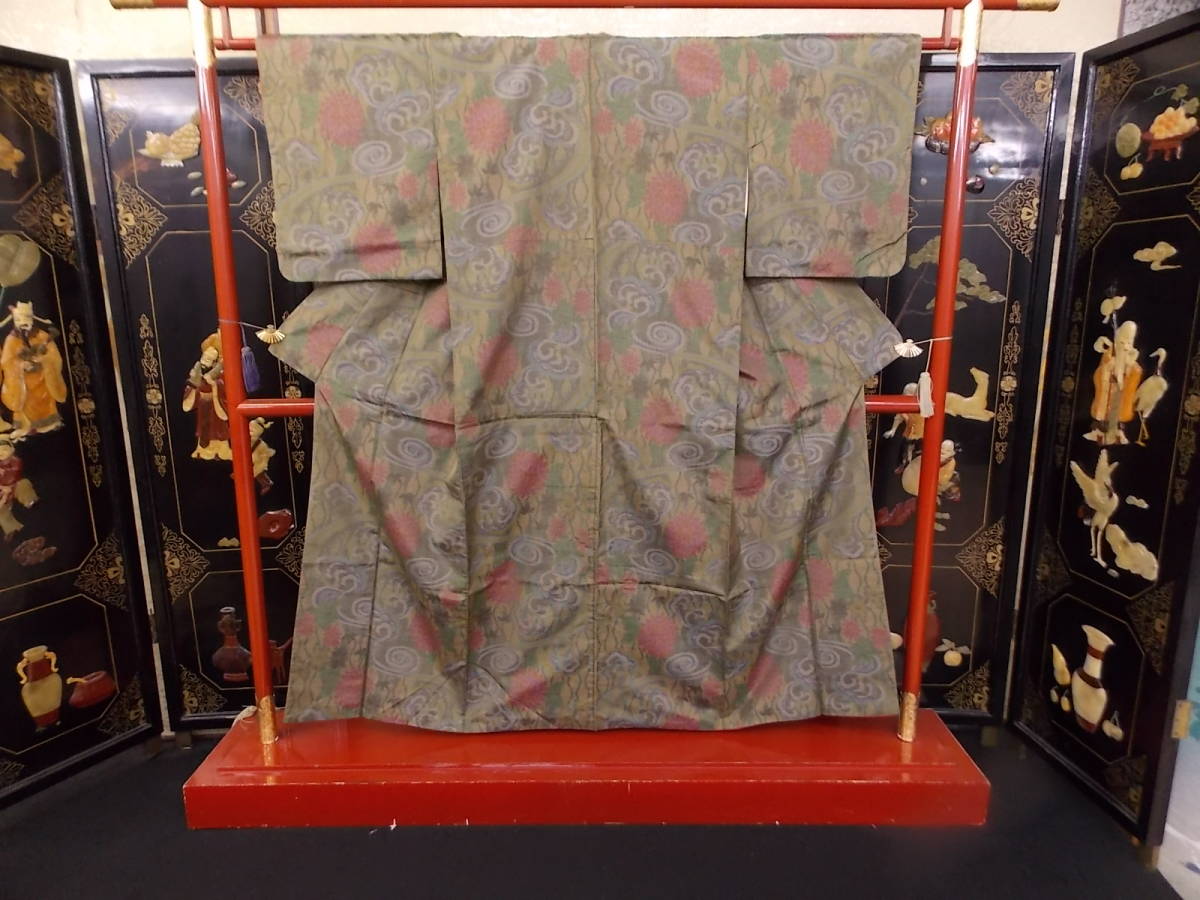 - きもの今昔3424 本場大島紬 緯総絣 全体わさび色調で水文や花柄