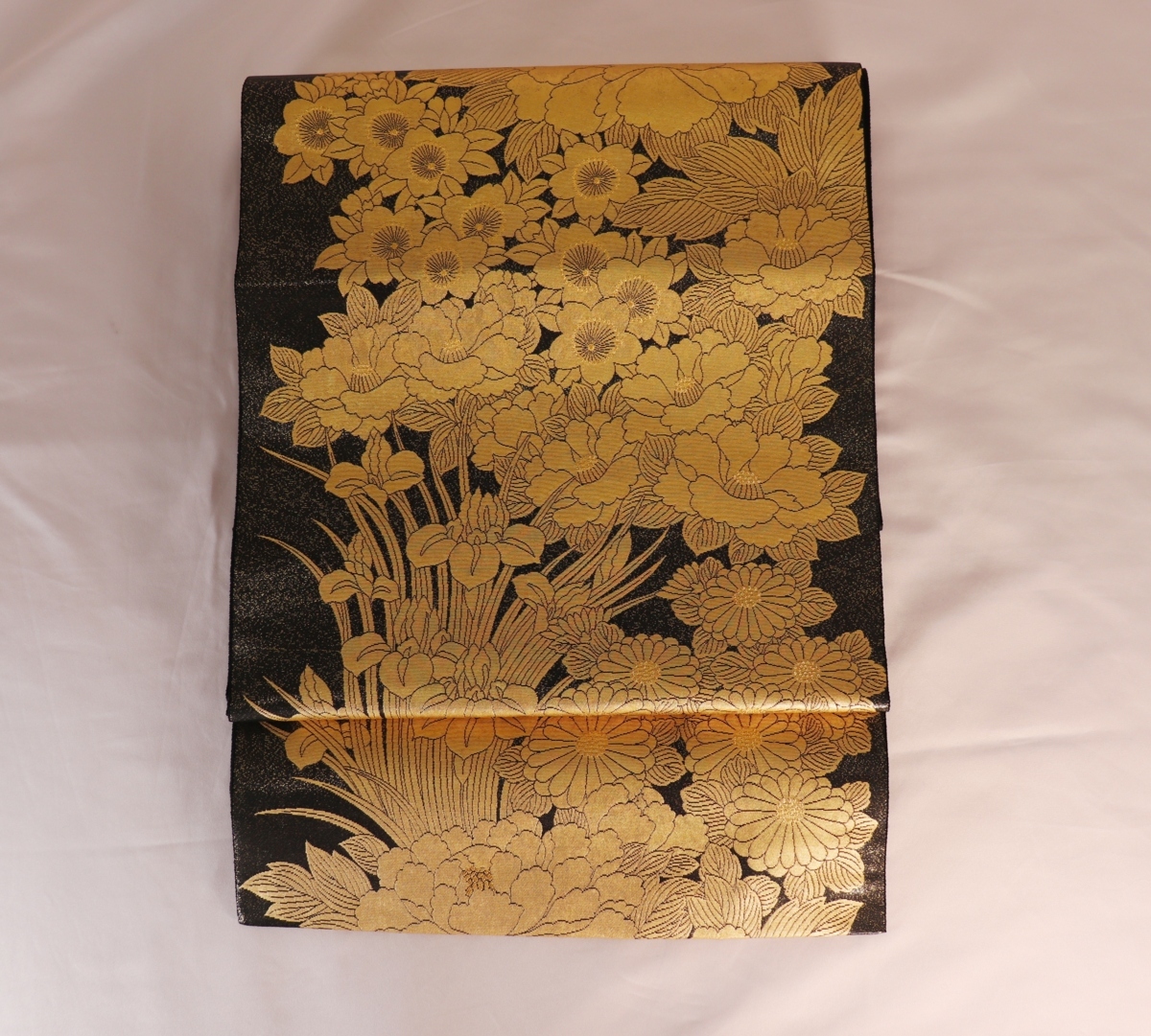 > 袋帯★長嶋成織物★逸品★未使用品★瀞金錦★漆箔★金×黒★桜★菊★あやめ★牡丹★花★仕立上り【ゆずりは】2890