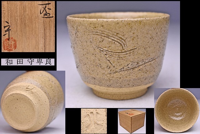 - 和太守卑良 ★ 笠間焼 ぐい呑 ★ 共箱 栞 ★ 流れる様な線文が味わいのある逸品 ★ 酒器 ★ ( 和田守卑良 )