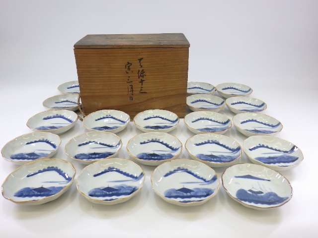 - h5G078Z1 時代物 染付 風景図 なます皿 小皿 20客 木箱付
