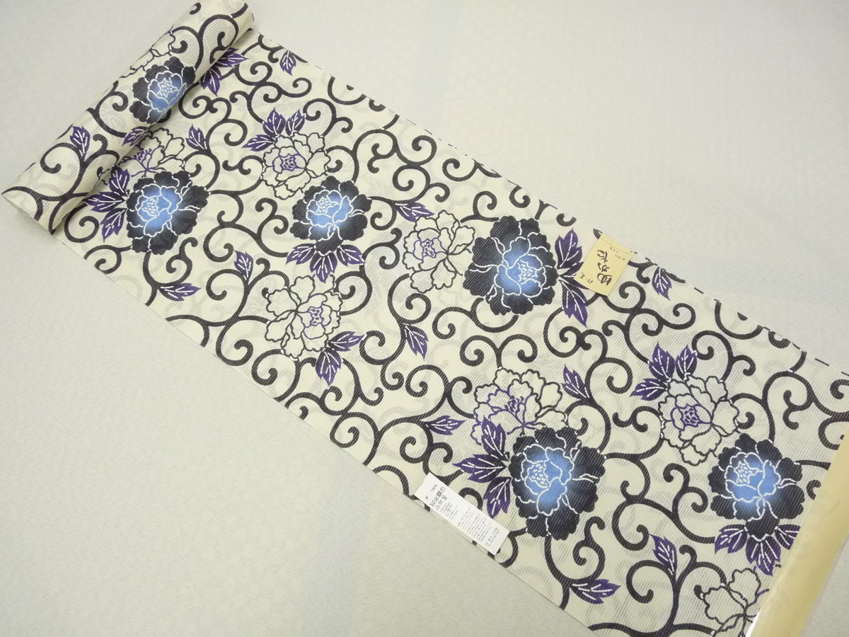 - まゆの四季/新品/日本製/浜松本染め/反物/綿絽/五本絽20-7牡丹唐草-水色ぼかし