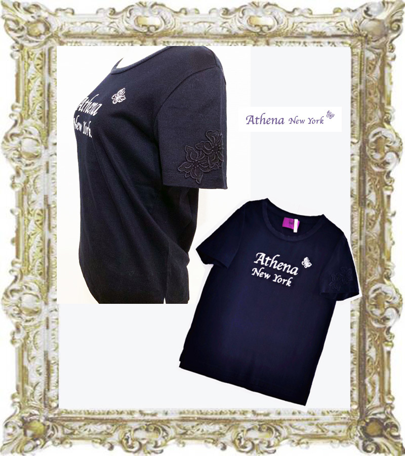 - 送料無料◆定価13,200円 AMACA×Athena NEW YORK アシーナニューヨーク 濃紺 袖にレースが付いた ロゴ入り 半袖Tシャツ 38