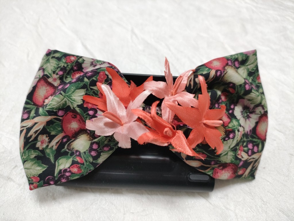 - 未使用経年品 シルクプリント輸入生地とオレンジ系アートフラワーコラボの髪飾り