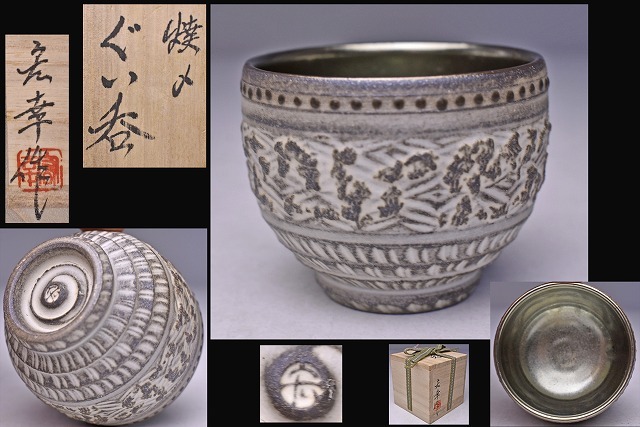 - 北川宏幸 ★ 焼〆ぐい呑 ★ 共箱 ★ 内側 鉄釉窯変 で 銀色 ★ 外側 白化粧を使った 象嵌 ★ 飛び鉋 見事 ★ 手間のかかった作品