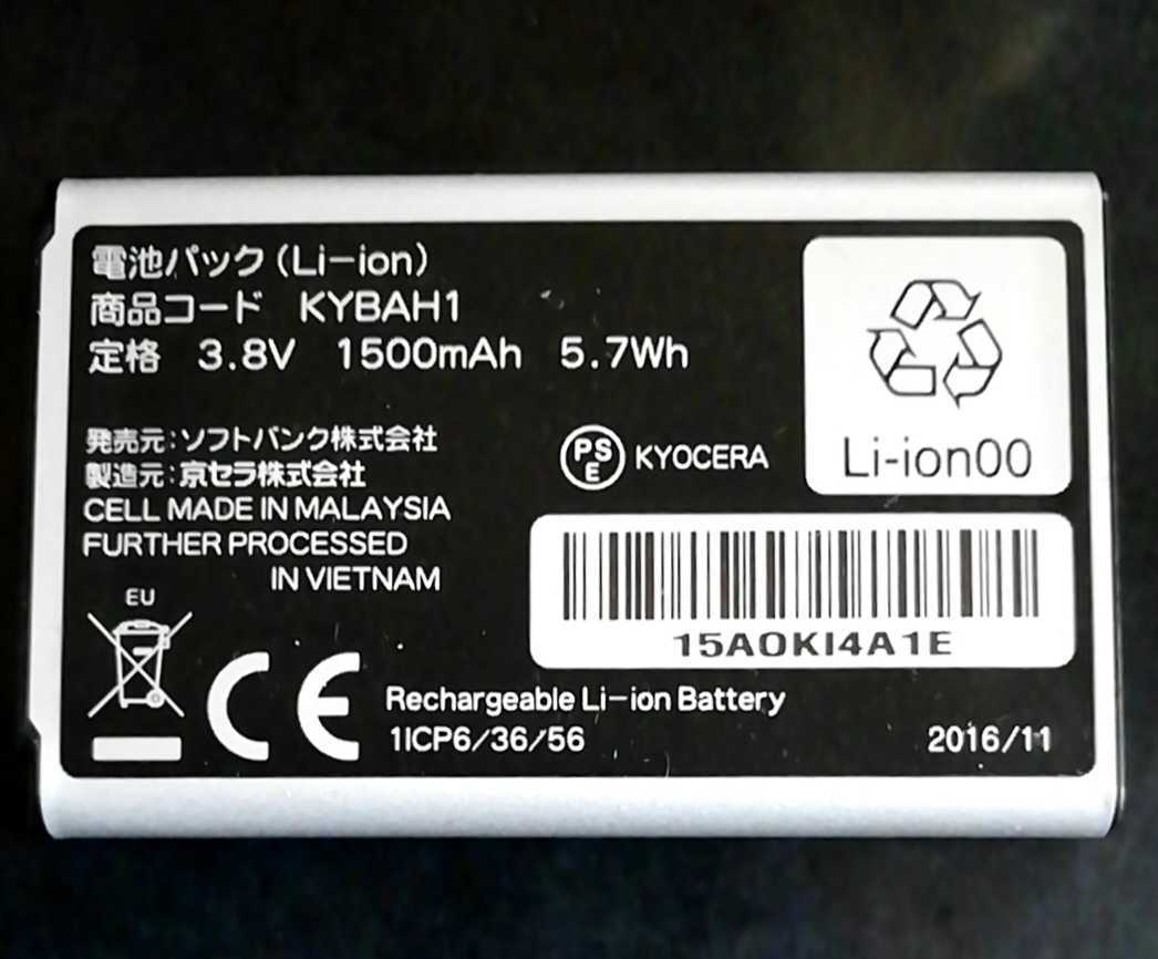 - 【中古】ソフトバンクKYBAH1純正電池パックバッテリー【充電確認済】対応機種(参考)501KC