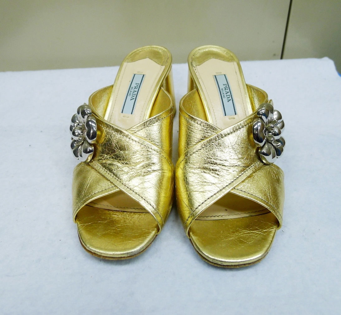 - ★PRADA/プラダ チャンキーヒール 花柄ビジュー付サンダル レザー 35サイズ ゴールド