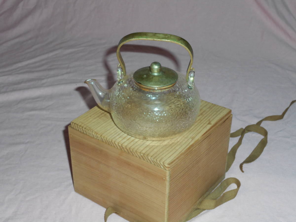 - ガラス酒器■ちろり、煎茶・茶道具・急須・銅ふた・真鍮持手■USED