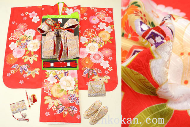 > 【進興館】七五三 新作 7歳用 女の子 高級 振袖 着物フルセット◆赤色系 鞠に桜◆【さざんか】1036-001