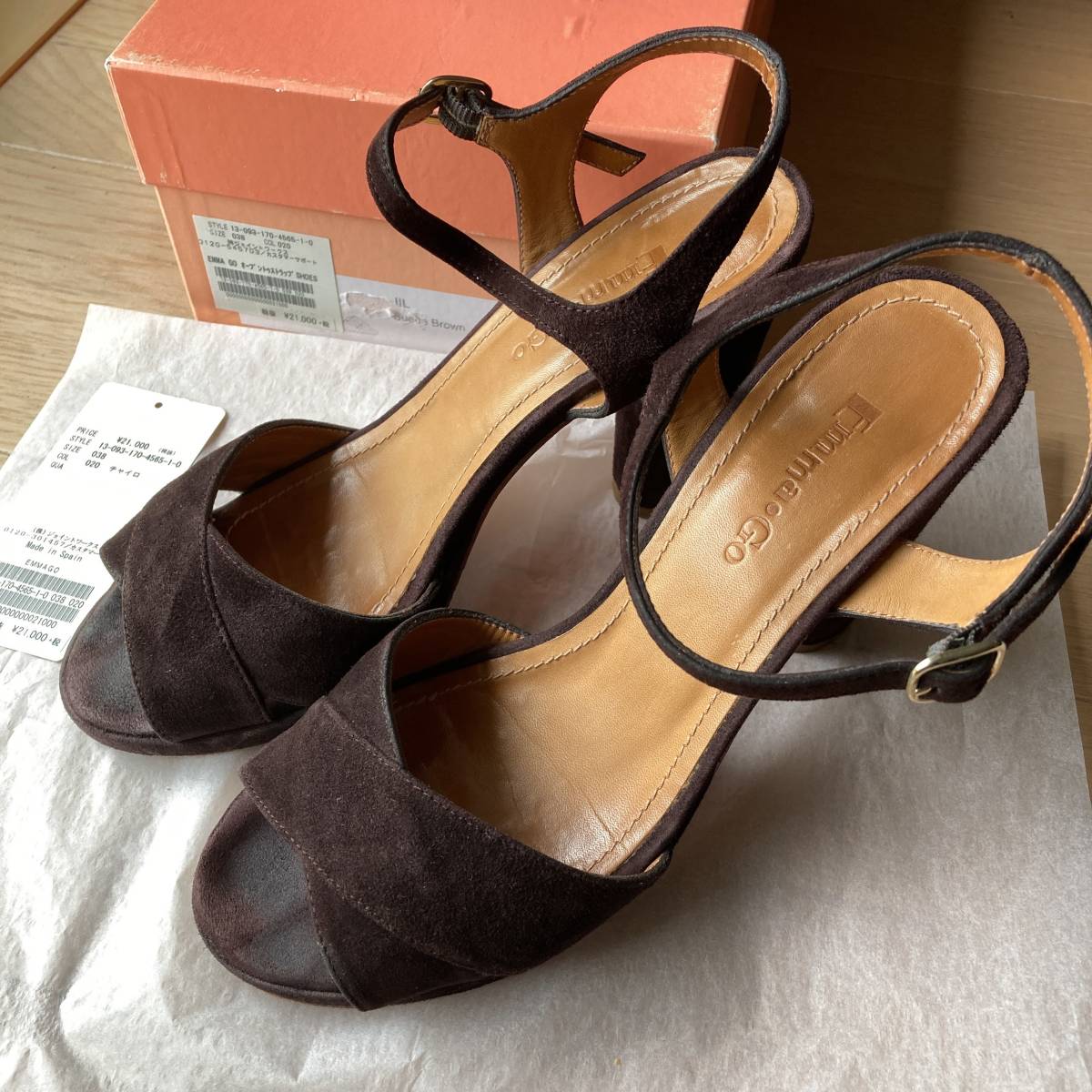 - Emma Go スエードサンダル 茶 レザー サイズ38 24.5 オープントゥストラップ 丸ヒール 革底 箱付き