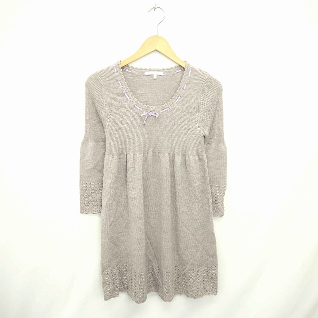 - レベッカテイラー rebecca taylor ワンピース ニット ひざ丈 丸首 リボン ウール 長袖 2 グレー パープル 灰 紫 /TT45 レディース