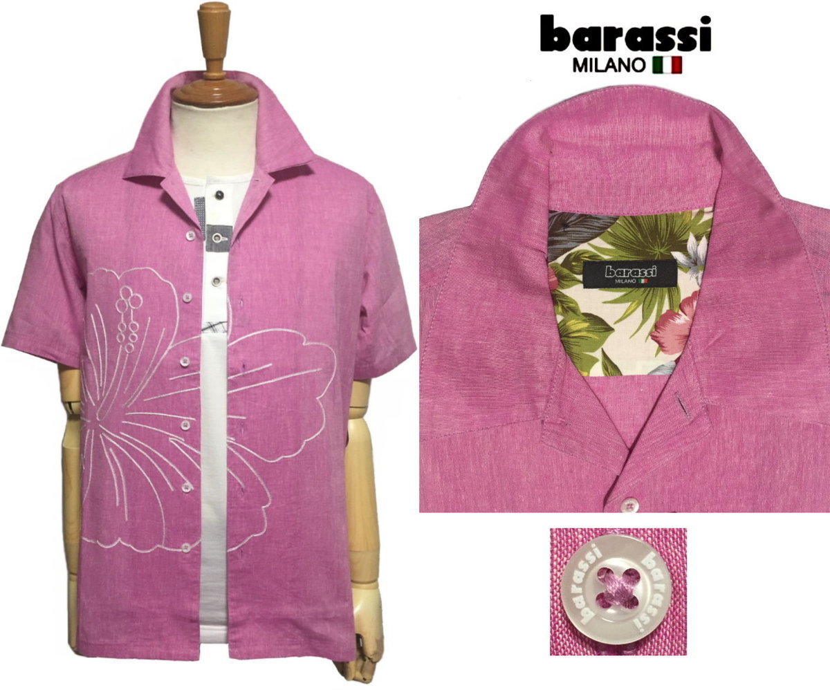 - barassi バラシ 清涼 綿麻 フラワー刺しゅう 半袖 開襟シャツ サーモン size46 M
