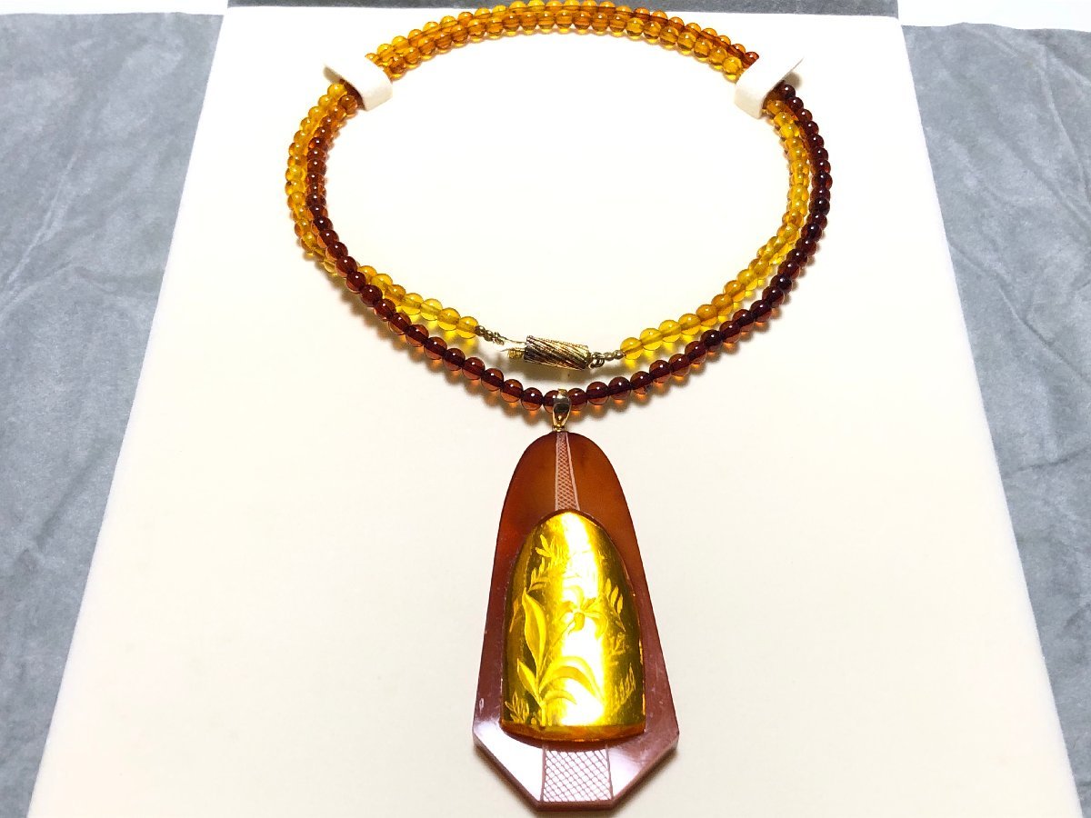 - ロシア宮廷芸術家 Petroff(ペトロフ) 本琥珀 K18 17.0g インタリオ 百合細工 デザイン ロングペンダントネックレス
