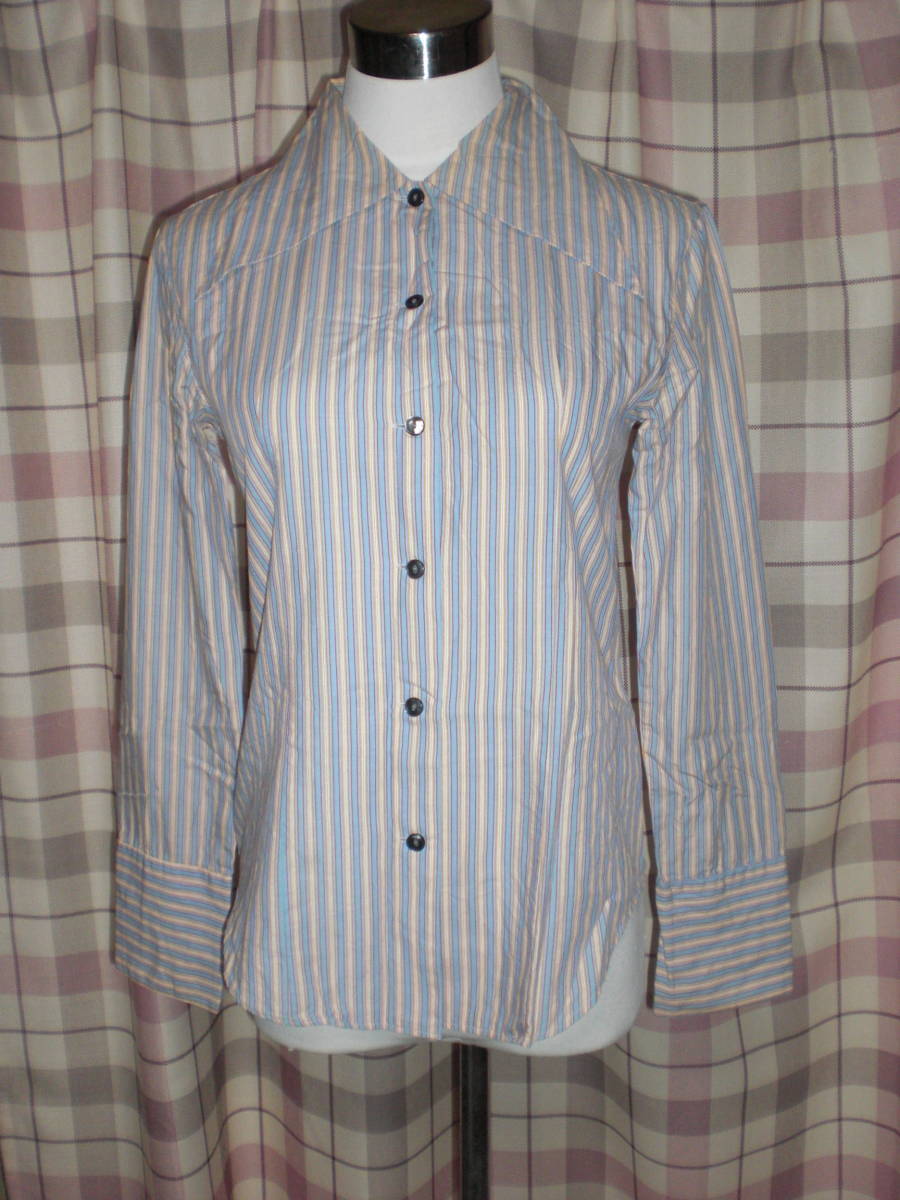 - 16)ELENCORE 青・ベージュ・赤ストライプ長袖デザインシャツ(USED、美品)