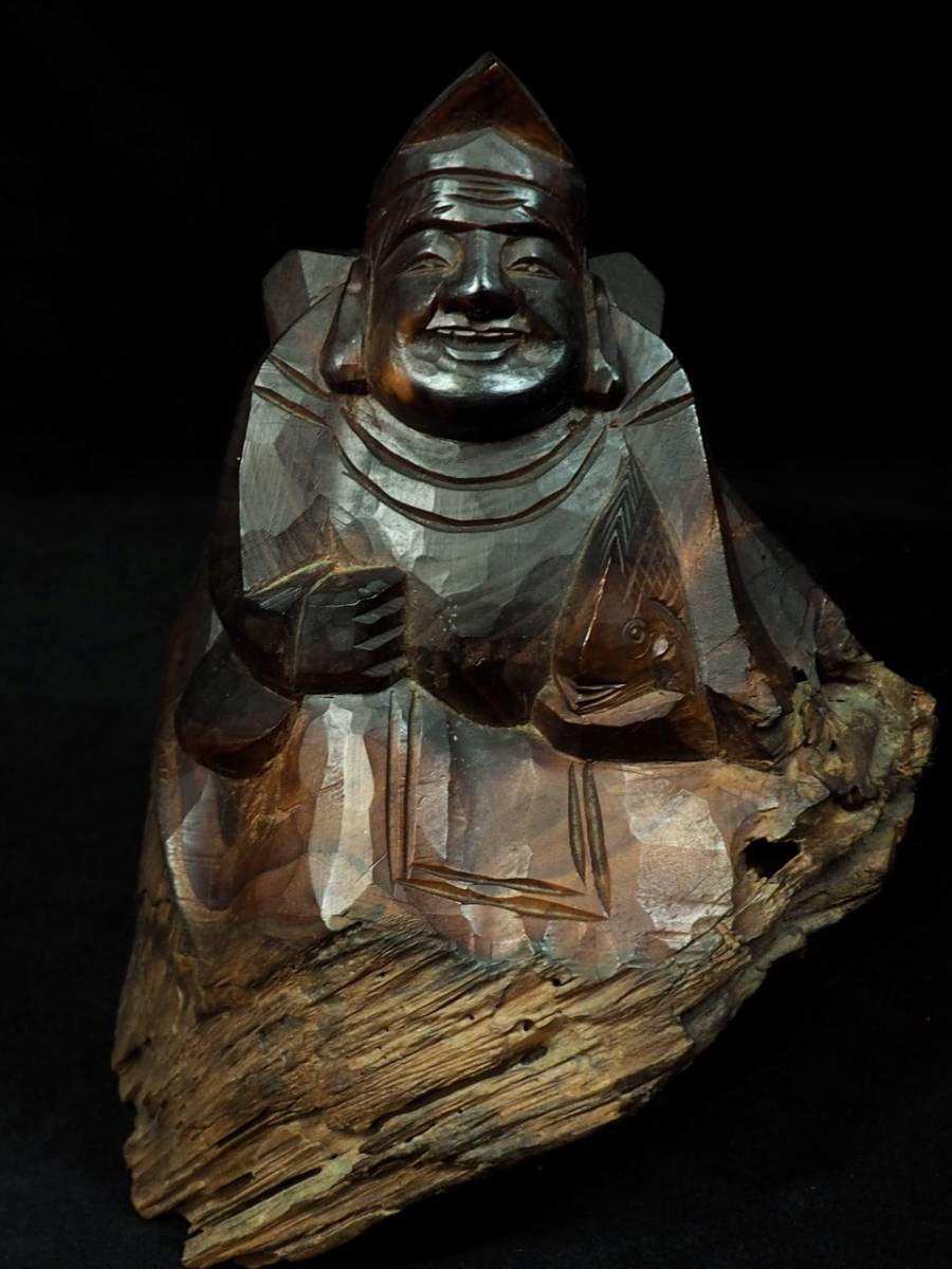 - 昭和初期 岳堂作 恵比寿像 讃岐一刀彫り 幅13cm 奥行き13cm 高さ18cm 丸太から丁寧に彫られた一点物の恵比寿様