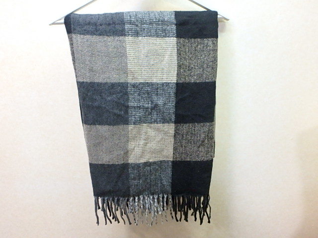 - n211k ストール 縦82×横176cm 黒×ベージュ×グレー チェック柄 防寒 古着 中古 マフラー レディース