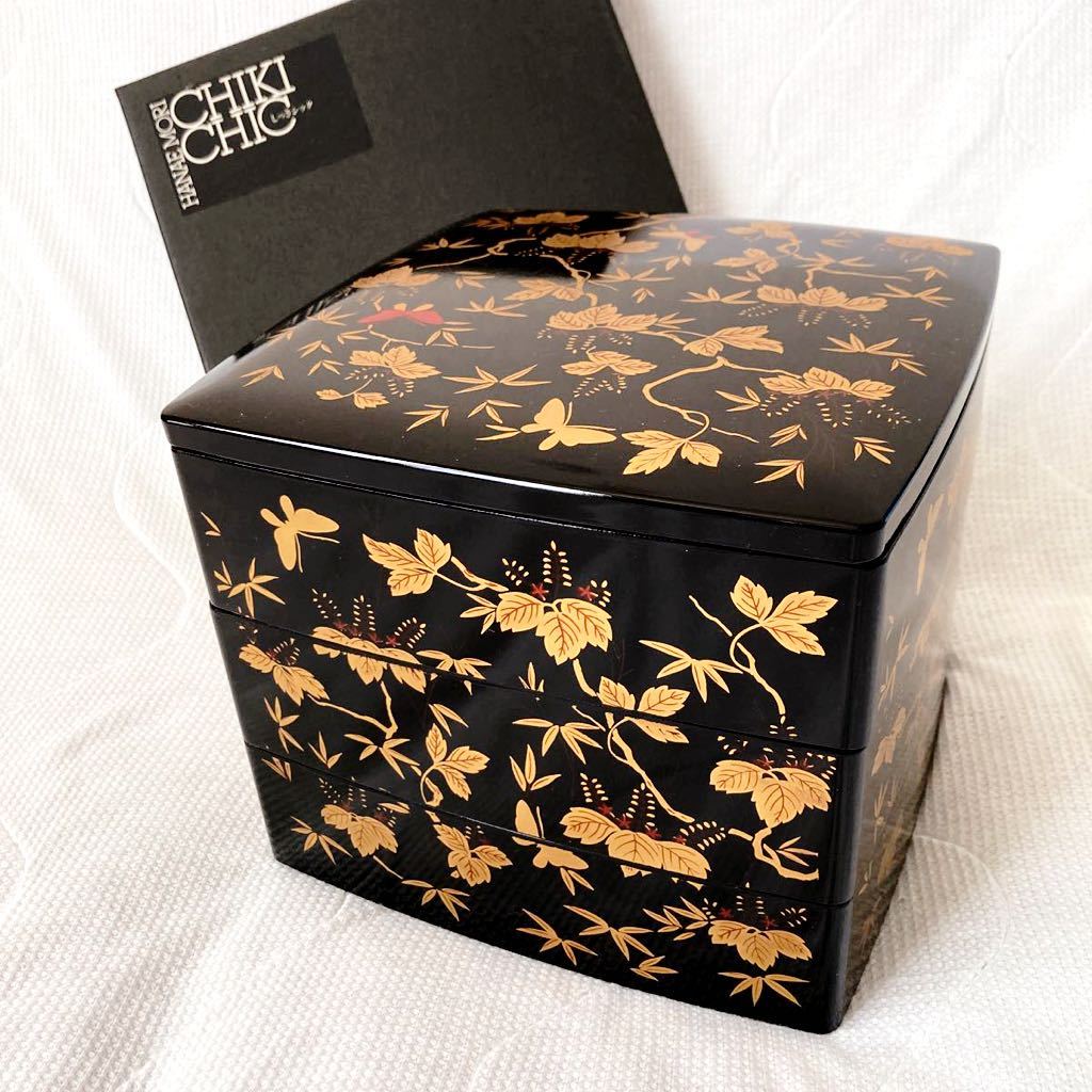 > g98)ハナエモリ 3段 重箱 森英恵 漆器 6.5胴張三段重 はなぎり CHIKI CHIC HANAE MORI おせち料理 花見 行楽 桐 蝶 黒