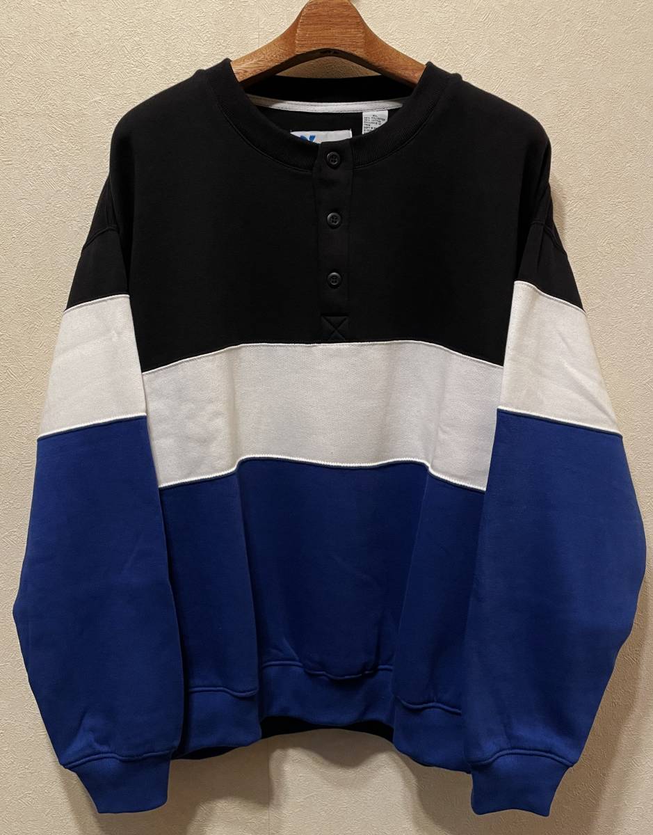> 希少カラーブロック美品90sオールド切替スウェットXLビッグシルエット3tone太ボーダー配色スエット黒/白/青ヘンリーネック90年代ビンテージ