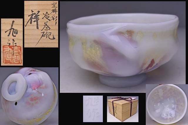 > 壹谷旭 ★ 窯稀彩 冷茶碗 『 祥 』★ 共箱 ★ 上作 ★ 師:白井幸次郎 ★ 白ガラスから見える金彩が妖艶な景色の逸品 ★ 硝子 茶道具 ★