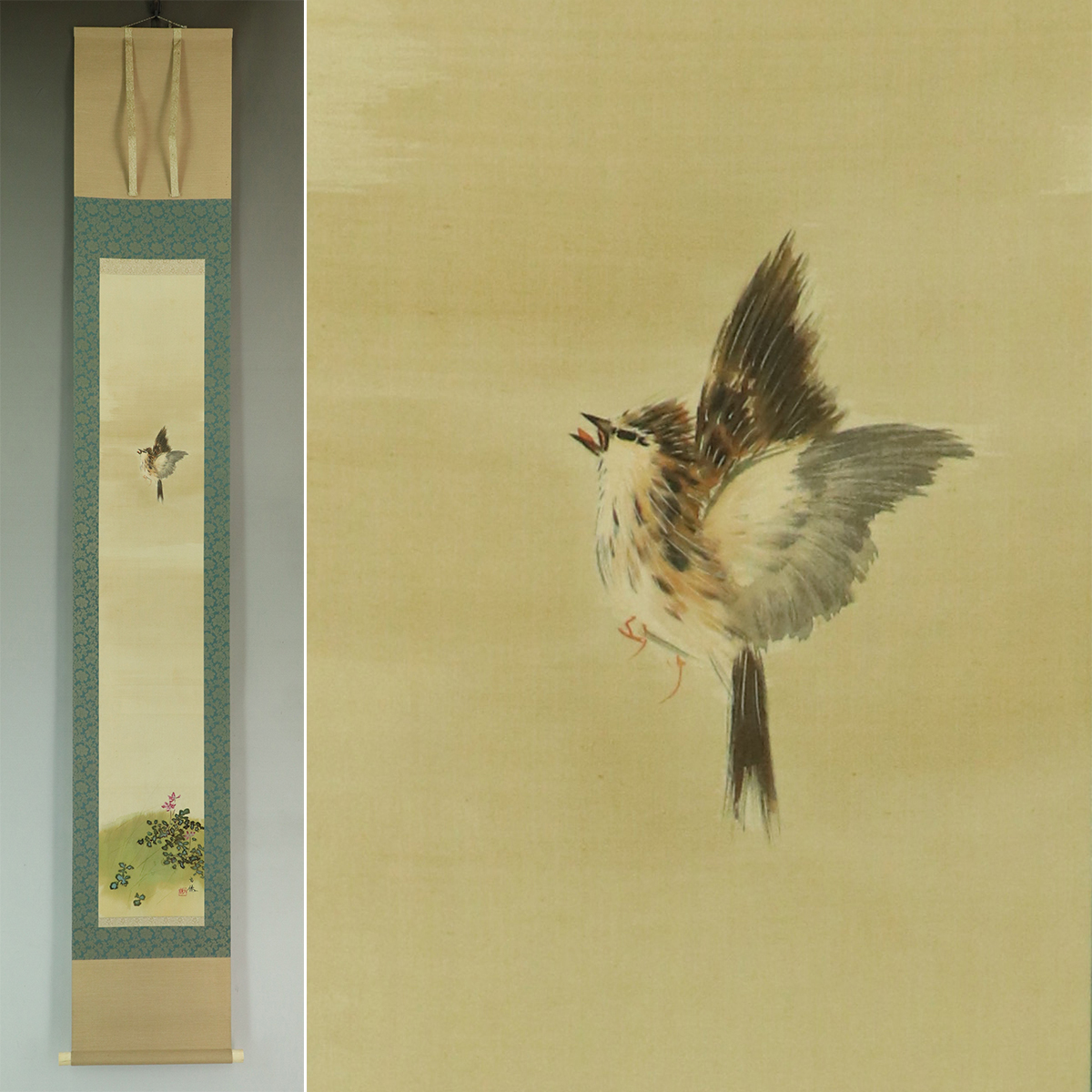 - 【真作】東原方僊【雲雀】◆絹本◆共箱◆掛軸 u09226