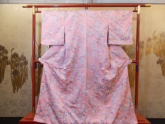 > きもの今昔4700 合繊きもの バチ衿袷仕立て ポリエステル100%綸子生地 ピンク色地草花模様 身丈160cm