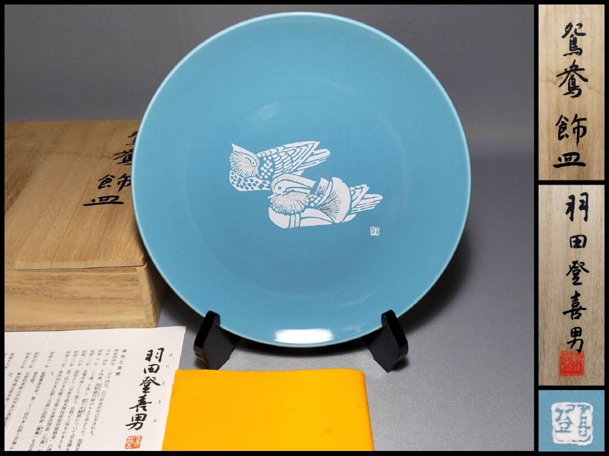 > FI16 羽田登喜男 皿 金彩 鴛鴦飾皿 直径24.8cm 栞・皿立て・共箱付 着物友禅 人間国宝