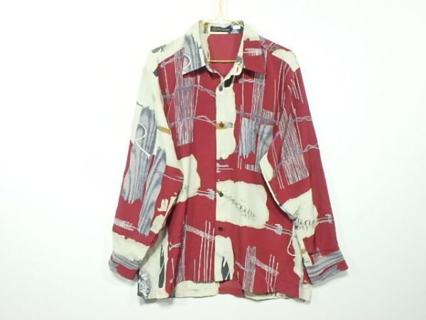 - 90's 総柄 古着シャツ 上質! レトロ 柄シャツ シルク フェザー/エンジ/和柄 M~L
