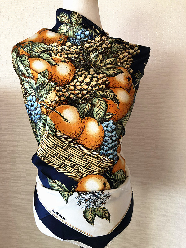 > 稀少柄 フランス製 Francois de Reix lyon Paris★葡萄 みかん柄 大判スカーフ ビンテージ(E2)