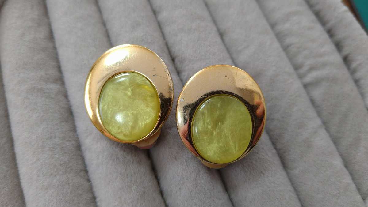 - □訳あり□エレガント&レトロ感□黄緑ビジュー×ゴールドカラー・オーバル型イヤリング□